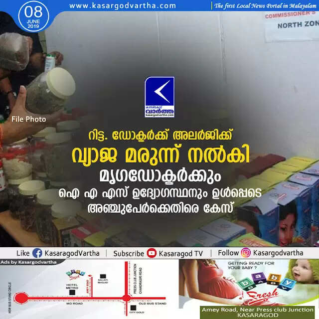 റിട്ട. ഡോക്ടര്‍ക്ക് അലര്‍ജിക്ക് വ്യാജ മരുന്ന് നല്‍കി; മൃഗഡോക്ടര്‍ക്കും ഐ എ എസ് ഉദ്യോഗസ്ഥനും ഉള്‍പ്പെടെ അഞ്ചുപേര്‍ക്കെതിരെ കേസ്