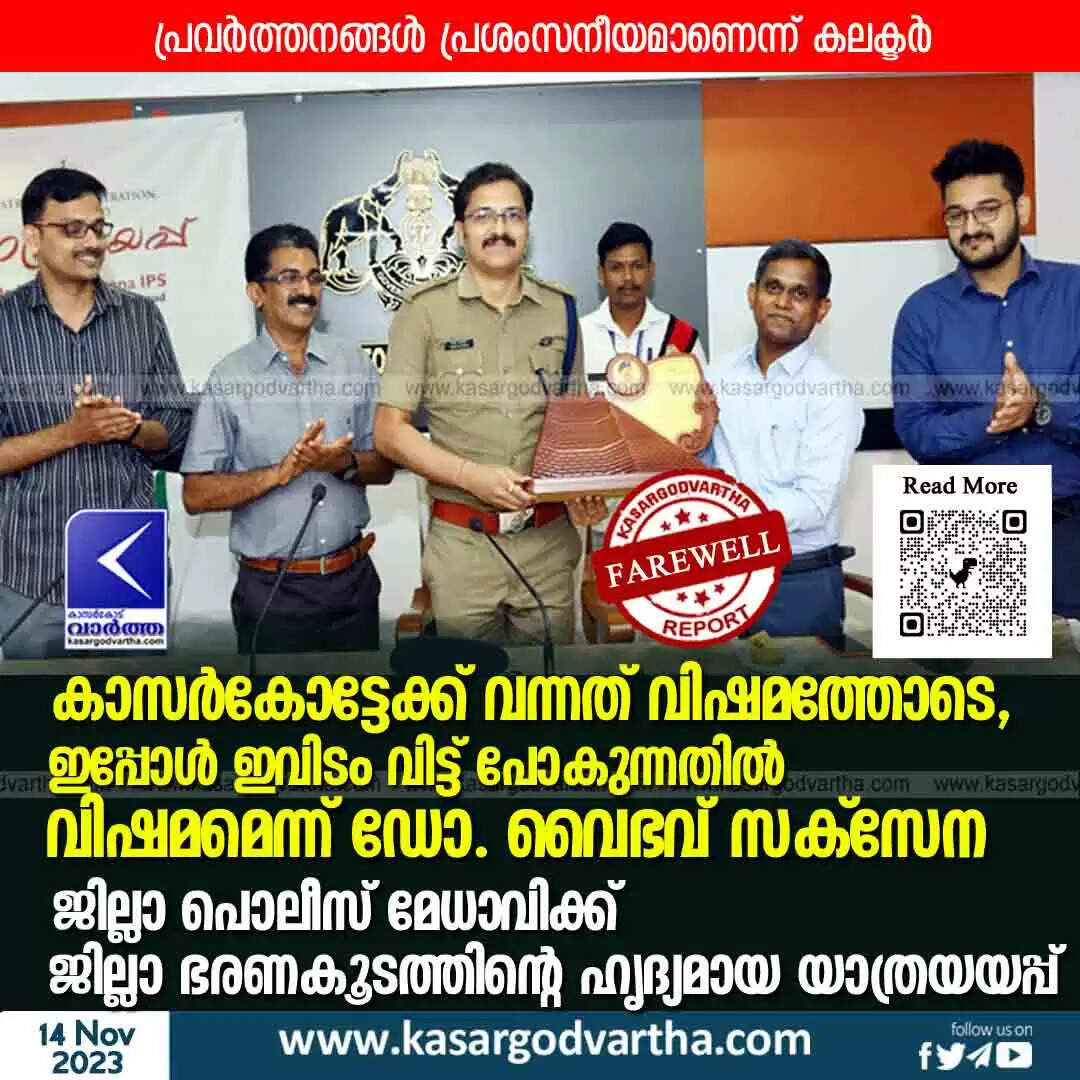 Farewell | 'കാസർകോട്ടേക്ക് വന്നത് വിഷമത്തോടെ', ഇപ്പോൾ ഇവിടം വിട്ട് പോകുന്നതിൽ വിഷമമെന്ന് ഡോ. വൈഭവ് സക്സേന; ജില്ലാ പൊലീസ് മേധാവിക്ക് ജില്ലാ ഭരണകൂടത്തിന്റെ ഹൃദ്യമായ യാത്രയയപ്പ്