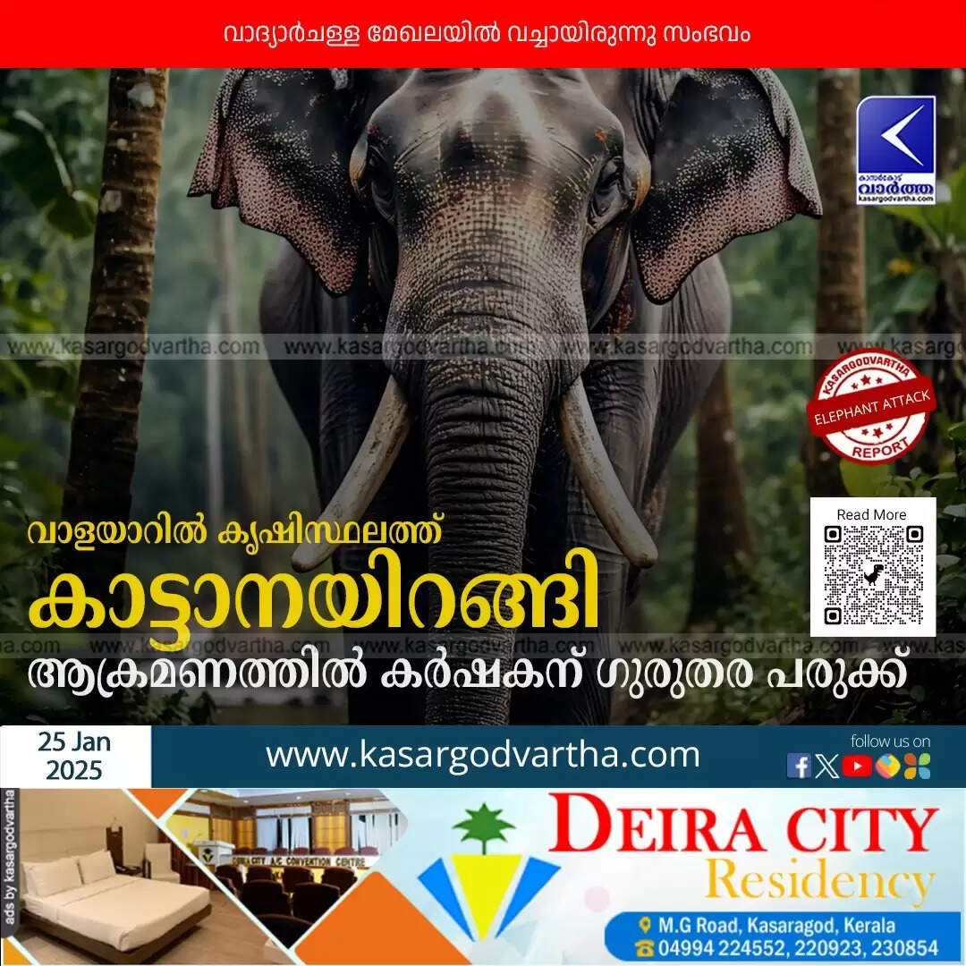 Farmer was seriously injured in a wild elephant attack in Walayar, Palakkad. The incident occurred when the farmer tried to chase away a herd of elephants that had entered his farmland.