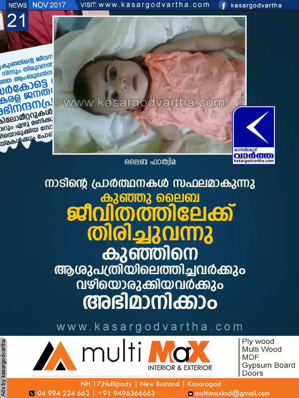 നാടിന്റെ പ്രാര്‍ത്ഥനകള്‍ സഫലമാകുന്നു; കുഞ്ഞു ലൈബ ജീവിതത്തിലേക്ക് തിരിച്ചുവന്നു, കുഞ്ഞിനെ ആശുപത്രിയിലെത്തിച്ചവര്‍ക്കും വഴിയൊരുക്കിയവര്‍ക്കും അഭിമാനിക്കാം