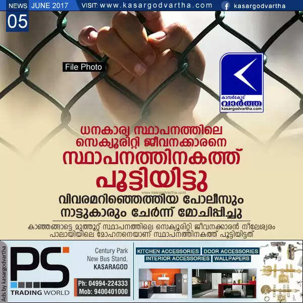 കാഞ്ഞങ്ങാട്: (www.kasargodvartha.com 05.06.2017) ധനകാര്യ സ്ഥാപനത്തിലെ സെക്യൂരിറ്റി ജീവനക്കാരനെ സ്ഥാപനത്തിനകത്ത് പൂട്ടിയിട്ടു. വിവരമറിഞ്ഞെത്തിയ പോലീസും നാട്ടുകാരും ചേര്‍ന്ന് മോചിപ്പിച്ചു. കാഞ്ഞങ്ങാട്ടെ മുത്തൂറ്റ് സ്ഥാപനത്തിലെ സെക്യൂരിറ്റി ജീവനക്കാരന്‍ നീലേശ്വരം പാലായിയിലെ മോഹന (52)നെയാണ് ഡ്യൂട്ടി കൃത്യമായി ചെയ്യുന്നുണ്ടെന്ന് ഉറപ്പിക്കാനായി സ്ഥാപനത്തിനകത്ത് ശനിയാഴ്ച വൈകിട്ടോടെ പൂട്ടിയിട്ടത്.