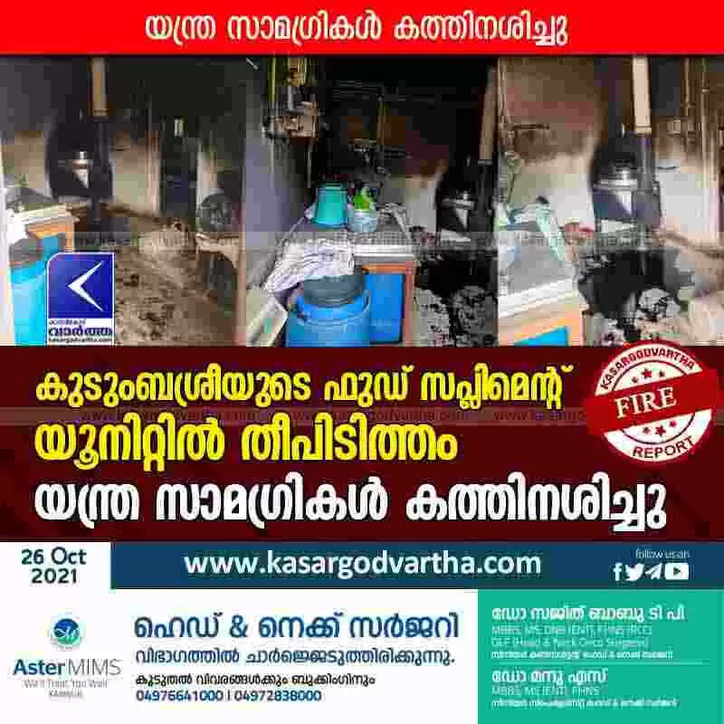 മുളിയാർ: (www.kasargodvartha.com 26.10.2021) പൊവ്വൽ ബെഞ്ച് കോർടിൽ പ്രവർത്തിക്കുന്ന മുളിയാർ കുടുംബശ്രീ സി ഡി എസ് നേതൃത്വത്തിലുള്ള അമൃതം ഫുഡ് സപ്ലിമെൻ്റ് യൂനിറ്റിൽ തീപിടിത്തം. യന്ത്ര സാമഗ്രികൾ കത്തിനശിച്ചു.