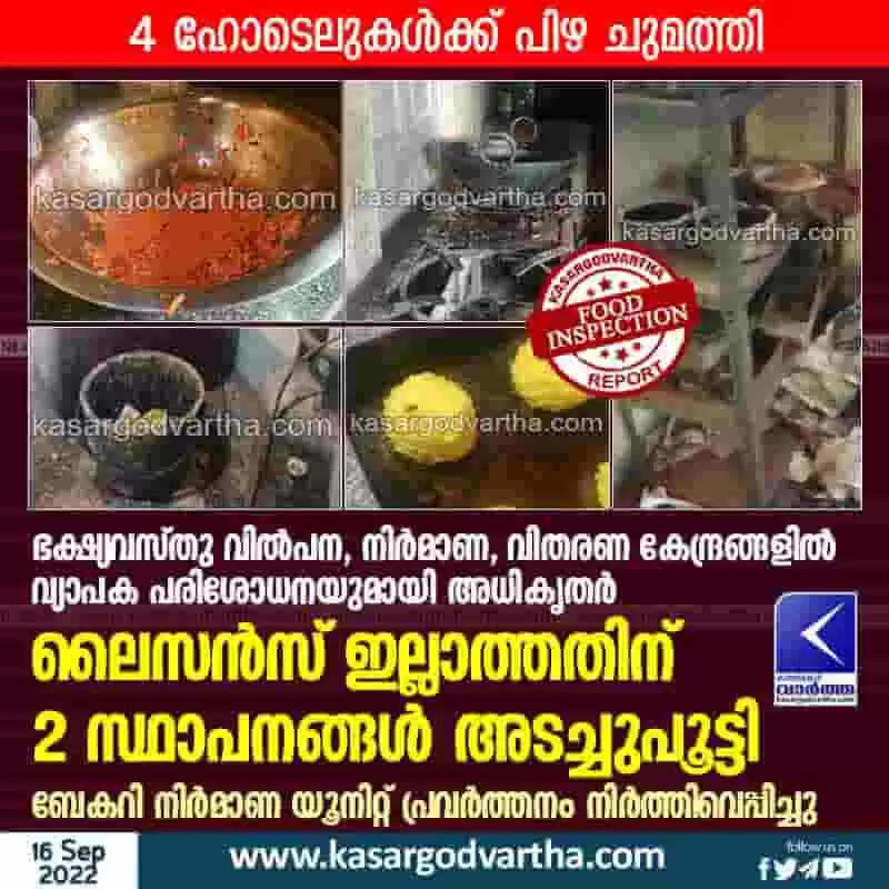 Food inspection | ഭക്ഷ്യവസ്തു വില്പന, നിര്മാണ, വിതരണ കേന്ദ്രങ്ങളില് വ്യാപക പരിശോധനയുമായി അധികൃതര്; 4 ഹോടെലുകള്ക്ക് പിഴ ചുമത്തി; ലൈസന്സ് ഇല്ലാത്തതിന് 2 സ്ഥാപനങ്ങള് അടച്ചുപൂട്ടി; ബേകറി നിര്മാണ യൂനിറ്റ് പ്രവര്ത്തനം നിര്ത്തിവെപ്പിച്ചു