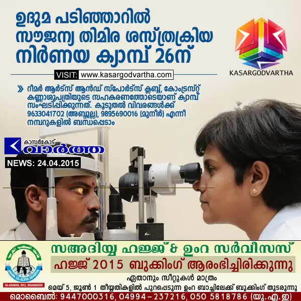 ഉദുമ പടിഞ്ഞാറില് സൗജന്യ തിമിര ശസ്ത്രക്രിയ നിര്ണയ ക്യാമ്പ് 26ന്
