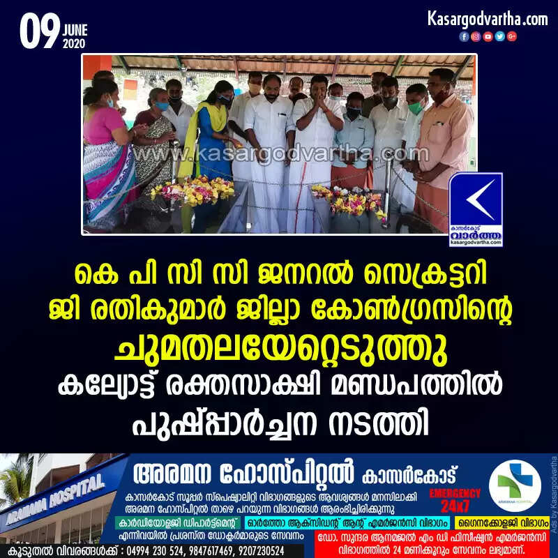 കാസര്‍കോട്: (www.kasargodvartha.com 09.06.2020) കെ പി സി സി ജനറല്‍ സെക്രട്ടറി ജി രതികുമാര്‍ കാസര്‍കോട് ജില്ലാ കോണ്‍ഗ്രസിന്റെ ചുമതലയേറ്റെടുത്തു. ചുമതലയേറ്റെടുക്കുന്നതിനു മുന്നോടിയായി കല്ല്യോട്ട് ശരത് ലാലിന്റെയും കൃപേഷിന്റേയും സ്മൃതി മണ്ഡപത്തില്‍ പുഷ്പാര്‍ച്ചന നടത്തി.
