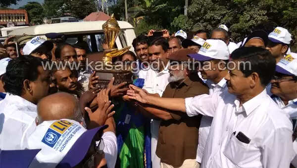കാലിക്കടവ്: (www.kasargodvartha.com 25.11.2019) 60-ാമത് സംസ്ഥാന സ്‌കൂള്‍ കലോത്സവത്തിന്റെ സ്വര്‍ണ്ണ കപ്പ് കാസര്‍കോട് ജില്ലയിലെത്തി. ജില്ലാ അതിര്‍ത്തിയായ കാലിക്കടവില്‍ സ്വര്‍ണകപ്പിന് വന്‍ സ്വീകരണമാണ് ലഭിച്ചത്. തിങ്കളാഴ്ച രാവിലെ 10 മണിക്ക് തൃക്കരിപ്പൂര്‍ എംഎല്‍എ എം രാജഗോപാലന്റെ നേതൃത്വത്തില്‍ നാട്ടുകാരും മറ്റും ചേര്‍ന്നാണ് സ്വര്‍ണ കപ്പിനെ സ്വീകരിച്ചത്.