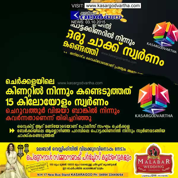 ചെര്ക്കളയിലെ കിണറ്റില് നിന്നും കണ്ടെടുത്തത് 15 കിലോയോളം സ്വര്ണം; ചെറുവത്തൂര് വിജയാ ബാങ്കില് നിന്നും കവര്ന്നതാണെന്ന് തിരിച്ചറിഞ്ഞു