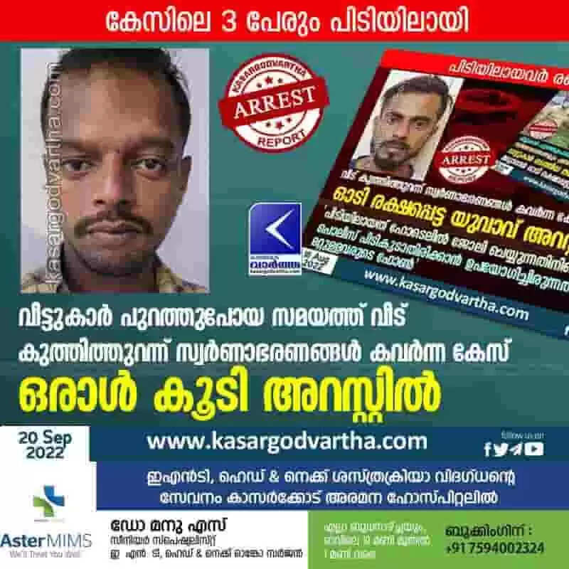 Arrested | വീട്ടുകാർ പുറത്തുപോയ സമയത്ത് വീട് കുത്തിത്തുറന്ന് സ്വര്ണാഭരണങ്ങള് കവര്ന്ന കേസ്: ഒരാൾ കൂടി അറസ്റ്റിൽ