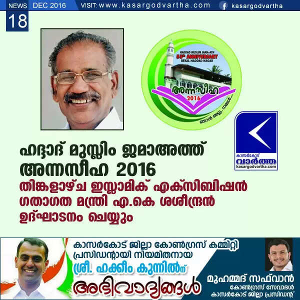 ഹദ്ദാദ് മുസ്ലിം ജമാഅത്ത് അന്നസീഹ 2016: തിങ്കളാഴ്ച ഇസ്ലാമിക് എക്സിബിഷന് ഗതാഗത മന്ത്രി എ.കെ ശശീന്ദ്രന് ഉദ്ഘാടനം ചെയ്യും