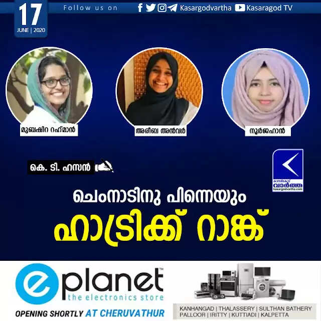 www.kasargodvartha.com 17.06.2020) വിദ്യാഭ്യാസരംഗത്തെ ചെംനാടിന്റെ ചരിത്രമികവു ശോഭയോടെ കാത്തുവയ്ക്കുകയാണു പുതുതലമുറ. കേരളീയരില് ആധുനികവിദ്യാഭ്യാസം സാര്വത്രികമാകുന്നതിനും മുന്നേ പെണ്ണുങ്ങളുടെ സ്കൂള് പോലും ഉണ്ടായിരുന്ന ചെംനാട്ട് മൂന്നു പെണ്കുട്ടികളാണ് കണ്ണൂര് സര്വകലാശാലയുടെ ശാസ്ത്രവിഭാഗം ഫലം പുറത്തുവന്നപ്പോള് ഇക്കുറി അറിവിന്റെ പൂത്തിരിവെളിച്ചം പകരുന്നത്. ശാസ്ത്രം പഠിക്കുന്നവര്ക്കു മുന്നിലുള്ള വഴി എഞ്ചിനീയര് അല്ലെങ്കില് മെഡിസിന് മാത്രമാണെന്ന സാമ്പ്രദായികധാരണയെ പൊളിച്ചെഴുതികയാണ്, ചെംനാട്ടുനിന്നു മുമ്പു പ്രശോഭിച്ച ചില കുട്ടികളെയെന്ന പോലെ ഇവരും. തങ്ങളുടെ താല്പര്യം അടിച്ചേല്പിക്കുന്നതിനു പകരം കുട്ടികളുടെ അഭിരുചിക്കിണങ്ങിയ കോഴ്സ് തെരഞ്ഞെടുക്കാന് അവസരം നല്കിയ രക്ഷിതാക്കളും ഏറെ അഭിനന്ദനം അര്ഹിക്കുന്നു.