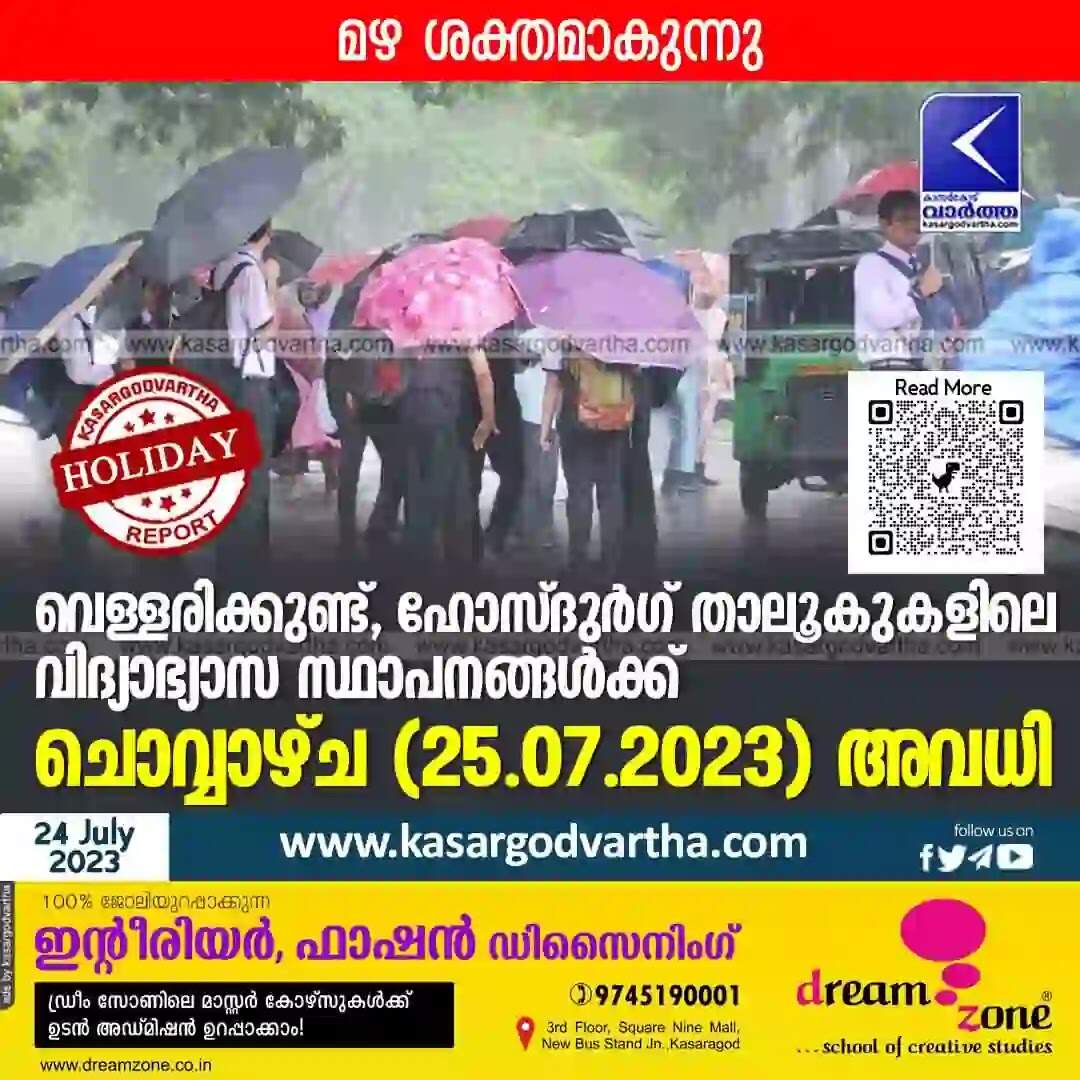 കാസര്‍കോട്: (www.kasargodvartha.com) ശക്തമായ മഴ തുടരുന്ന സാഹചര്യത്തില്‍ കാസര്‍കോട് ജില്ലയിലെ വെള്ളരിക്കുണ്ട്, ഹോസ്ദുര്‍ഗ് താലൂകുകളിലെ സ്റ്റേറ്റ്, സി ബി എസ് ഇ, ഐ സി എസ് സി സ്‌കൂളുകള്‍, കേന്ദ്രീയ വിദ്യാലയങ്ങള്‍, അങ്കണവാടികള്‍, മദ്രസകള്‍ തുടങ്ങിയ വിദ്യാഭ്യാസ സ്ഥാപനങ്ങള്‍ക്ക് ചൊവ്വാഴ്ച (25-07-2023) ജില്ലാ കലക്ടര്‍ ഇമ്പശേഖര്‍ കെ, ഐ എ എസ് അവധി പ്രഖ്യാപിച്ചു.