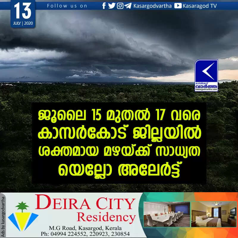 ജൂലൈ 15 മുതല് 17 വരെ കാസര്കോട് ജില്ലയില് ശക്തമായ മഴയ്ക്ക് സാധ്യത; യെല്ലോ അലേര്ട്ട്