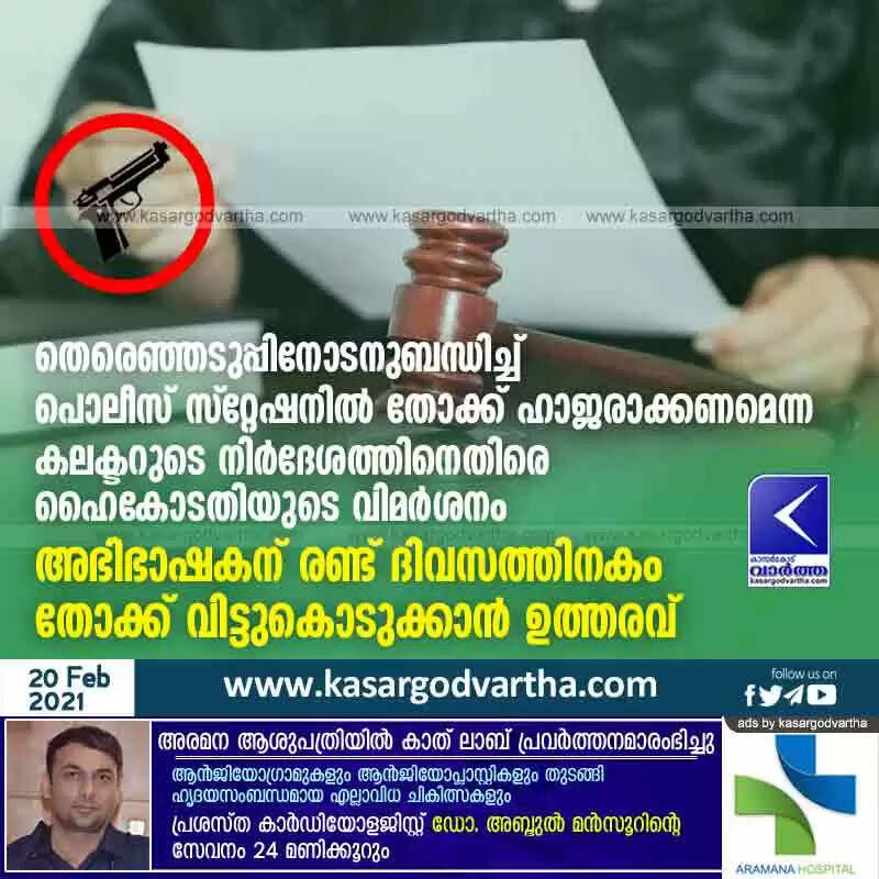 തെരെഞ്ഞടുപ്പിനോടനുബന്ധിച്ച് പൊലീസ് സ്റ്റേഷനിൽ തോക്ക് ഹാജരാക്കണമെന്ന കലക്ടറുടെ നിർദേശത്തിനെതിരെ ഹൈകോടതിയുടെ വിമർശനം; അഭിഭാഷകന് രണ്ട് ദിവസത്തിനകം തോക്ക് വിട്ടുകൊടുക്കാൻ ഉത്തരവ്