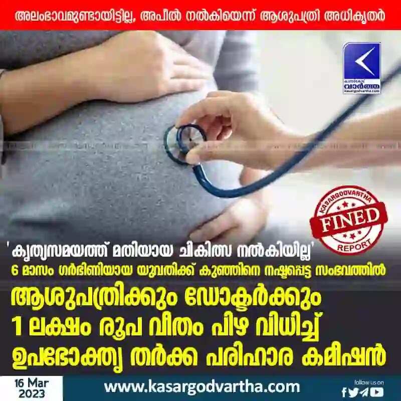 Fined | 'കൃത്യസമയത്ത് മതിയായ ചികിത്സ നല്‍കിയില്ല'; 6 മാസം ഗര്‍ഭിണിയായ യുവതിക്ക് കുഞ്ഞിനെ നഷ്ടപ്പെട്ട സംഭവത്തില്‍ ആശുപത്രിക്കും ഡോക്ടര്‍ക്കും 1 ലക്ഷം രൂപ വീതം പിഴ വിധിച്ച് ഉപഭോക്തൃ തര്‍ക്ക പരിഹാര കമീഷന്‍