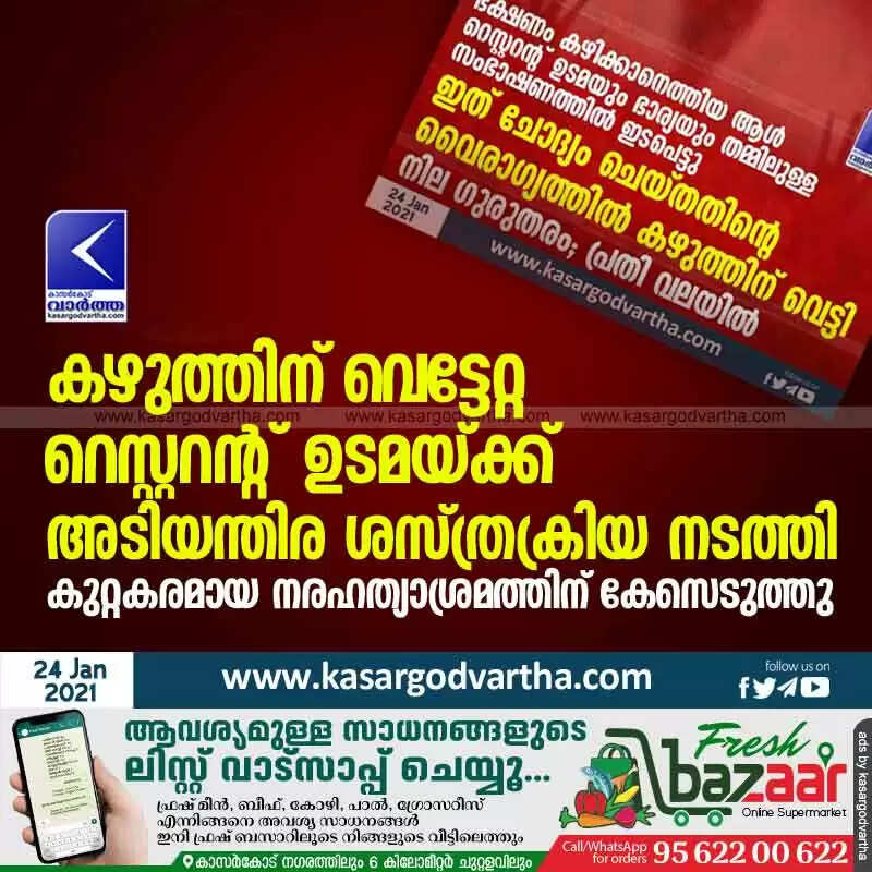 ചട്ടഞ്ചാൽ: (www.kasargodvartha.com 24.01.2021) ഭക്ഷണം കഴിക്കാനെത്തിയ ആൾ റെസ്റ്ററന്റ് ഉടമയും ഭാര്യയും തമ്മിലുള്ള സംഭാഷണത്തിൽ ഇടപെടുകയും ഇത് ചോദ്യം ചെയ്തതിൻ്റെ വൈരാഗ്യത്തിൽ കറികത്തിയെടുത്ത് കഴുത്തിന് വെട്ടിയതിനെ തുടർന്ന് മംഗളൂരു ആശുപത്രിയിൽ പ്രവേശിപ്പിക്കപ്പെട്ട റെസ്റ്ററന്റ് ഉടമയ്ക്ക് അടിയന്തിര ശസ്ത്രക്രിയ നടത്തി. സംഭവത്തിൽ പ്രതിക്കെതിരെ കുറ്റകരമായ നരഹത്യാശ്രമത്തിന് കേസെടുത്തു.