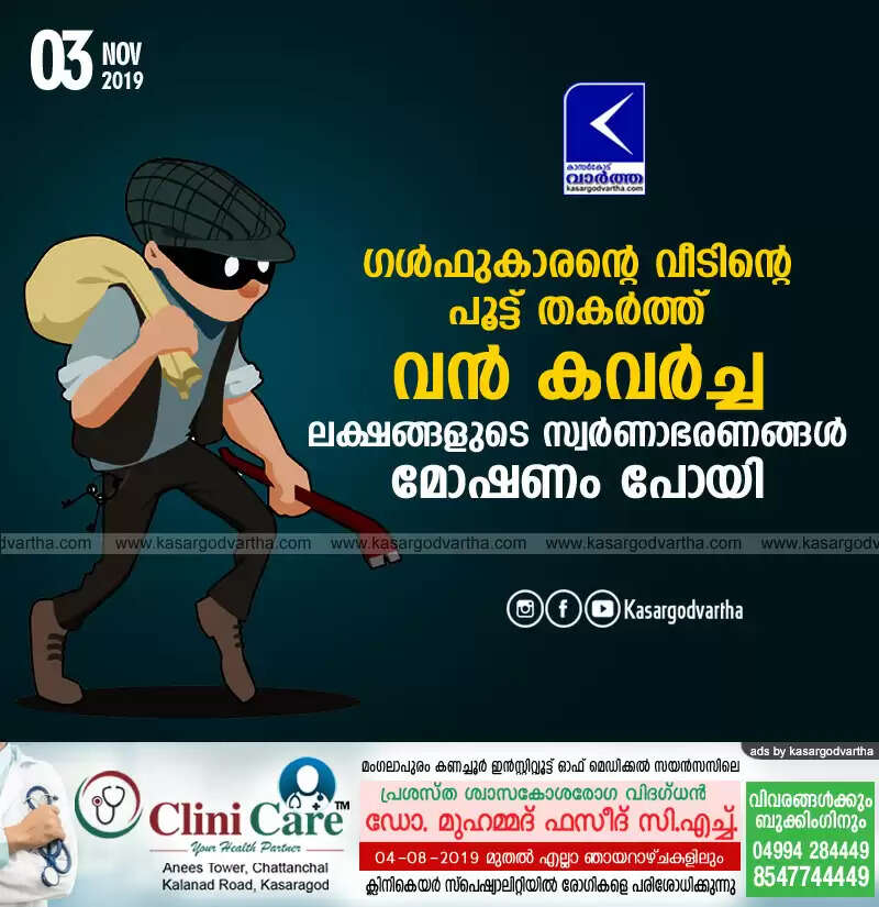 ഗള്ഫുകാരന്റെ വീടിന്റെ പൂട്ട് തകര്ത്ത് വന് കവര്ച്ച; ലക്ഷങ്ങളുടെ സ്വര്ണാഭരണങ്ങള് മോഷണം പോയി