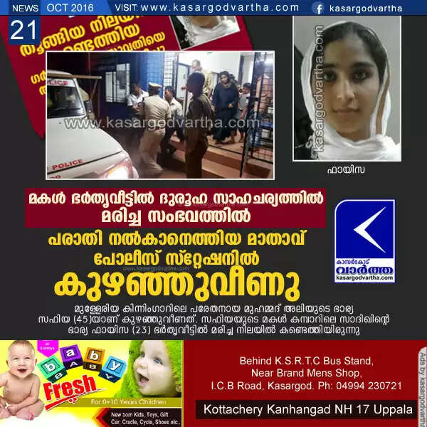 മകള് ഭര്തൃവീട്ടില് ദുരൂഹ സാഹചര്യത്തില് മരിച്ച സംഭവത്തില് പരാതി നല്കാനെത്തിയ മാതാവ് പോലീസ് സ്റ്റേഷനില് കുഴഞ്ഞുവീണു