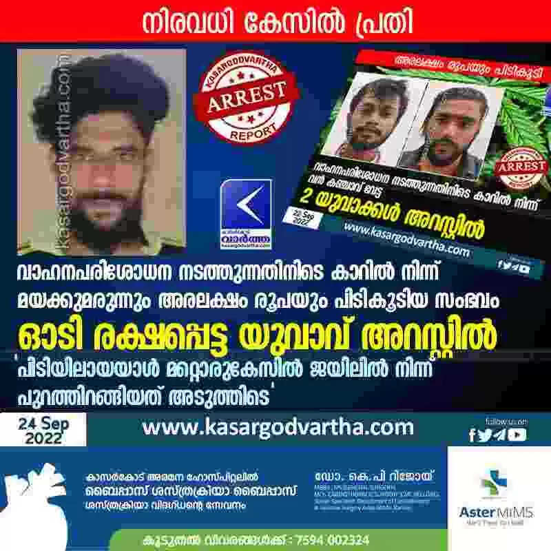 Youth arrested | വാഹനപരിശോധന നടത്തുന്നതിനിടെ കാറിൽ നിന്ന് മയക്കുമരുന്നും അരലക്ഷം രൂപയും പിടികൂടിയ സംഭവം: ഓടി രക്ഷപ്പെട്ട യുവാവ് അറസ്റ്റിൽ; 'പിടിയിലായയാൾ മറ്റൊരുകേസിൽ ജയിലിൽ നിന്ന് പുറത്തിറങ്ങിയത് അടുത്തിടെ'