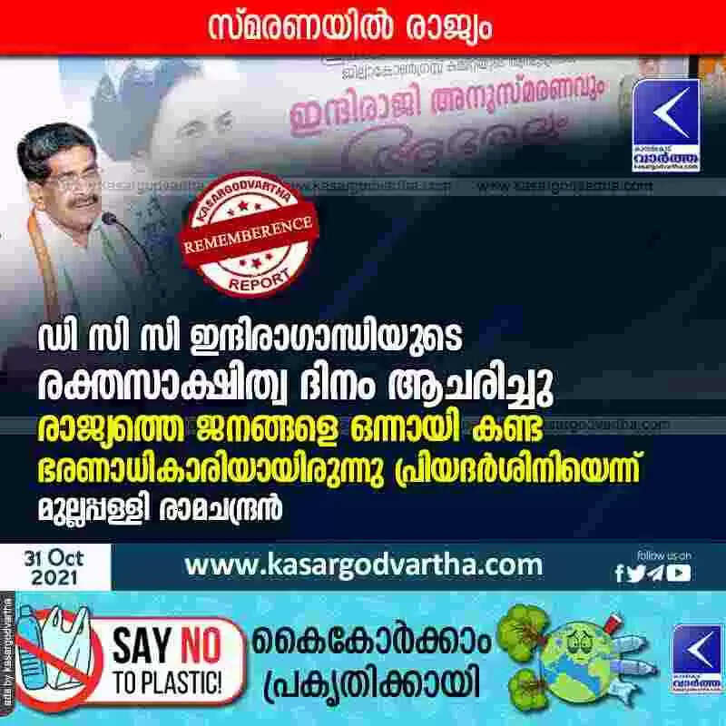 ഡി സി സി ഇന്ദിരാഗാന്ധിയുടെ രക്തസാക്ഷിത്വ ദിനം ആചരിച്ചു; രാജ്യത്തെ ജനങ്ങളെ ഒന്നായി കണ്ട ഭരണാധികാരിയായിരുന്നു പ്രിയദർശിനിയെന്ന് മുല്ലപ്പള്ളി രാമചന്ദ്രൻ