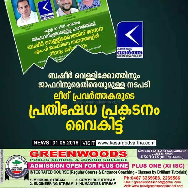 Keywords: Kasaragod, Kerala, Kanhangad, Muslim-league, Kallatra Mahin Haji, M.P Jafer, Basheer Vellikkoth, Commission report, IUML action against leaders: protest in Kanhangad at 4.30.