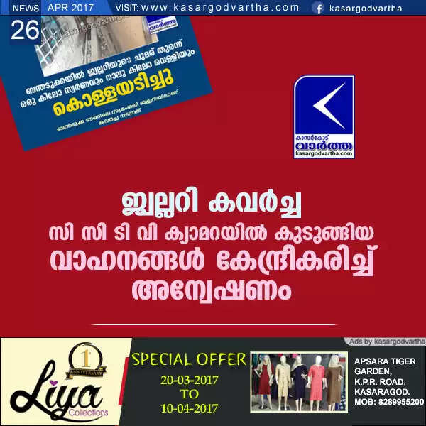 Keywords: Kasaragod, Vehicles, Investigation, Gold, Bandaduka, Car, Bike, Police, Robbery, CCTV, Silver, Jewellery robbery; Enquiry focuses on vehicles.