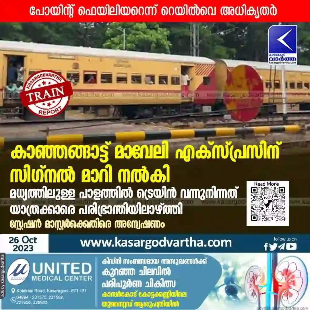 Train | കാഞ്ഞങ്ങാട്ട് മാവേലി എക്‌സ്പ്രസിന് സിഗ്‌നല്‍ മാറി നല്‍കി; മധ്യത്തിലുള്ള പാളത്തില്‍ ട്രെയിന്‍ വന്നുനിന്നത് യാത്രക്കാരെ പരിഭ്രാന്തിയിലാഴ്ത്തി; സ്റ്റേഷന്‍ മാസ്റ്റര്‍ക്കെതിരെ അന്വേഷണം