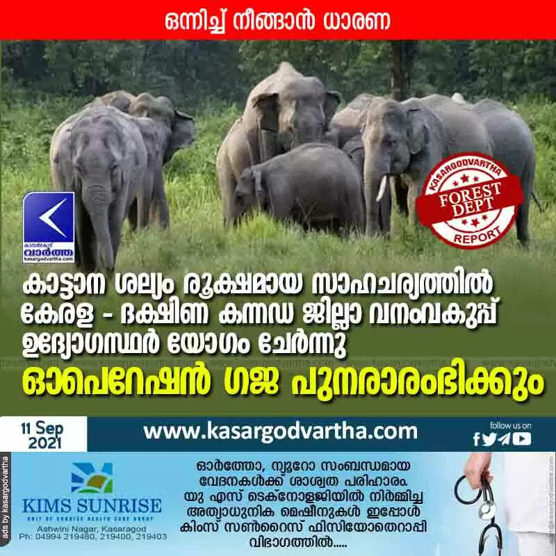 കാട്ടാന ശല്യം രൂക്ഷമായ സാഹചര്യത്തിൽ കേരള - ദക്ഷിണ കന്നഡ ജില്ലാ വനം വകുപ്പ് ഉദ്യോഗസ്ഥർ യോഗം ചേർന്നു; ഒന്നിച്ച് നീങ്ങാൻ ധാരണ; ഓപെറേഷന്‍ ഗജ പുനരാരംഭിക്കും