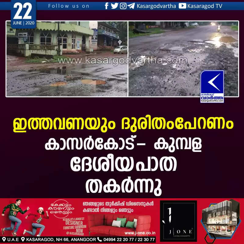 Keywords: Kasaragod, Kerala, News, Kumbala, National highway, Road-damage, Kasaragod-Kumbala National Highway damaged