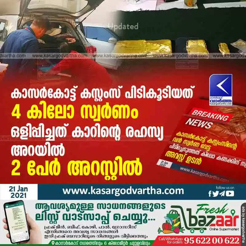 കാസർകോട്ട് കസ്റ്റംസ് പിടികൂടിയത് 4 കിലോ സ്വർണം; സ്വർണം ഒളിപ്പിച്ചത് കാറിൻ്റെ രഹസ്യ അറയിൽ; 2 പേർ അറസ്റ്റിൽ
