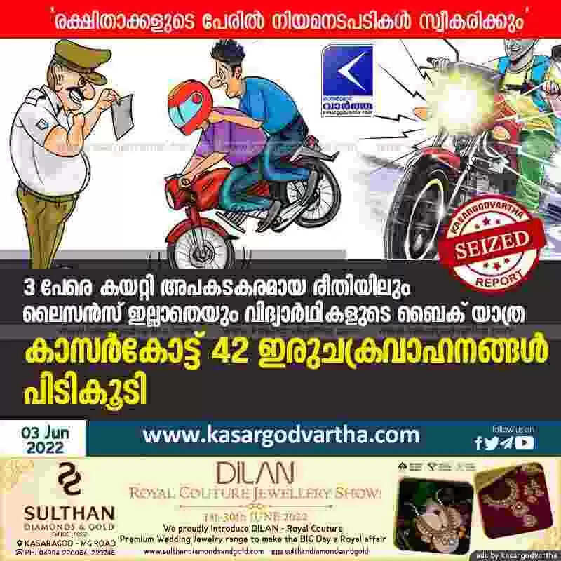 Police action | 3 പേരെ കയറ്റി അപകടകരമായ രീതിയിലും ലൈസൻസ് ഇല്ലാതെയും വിദ്യാർഥികളുടെ ബൈക് യാത്ര; കാസർകോട്ട് 42 ഇരുചക്രവാഹനങ്ങൾ പിടികൂടി