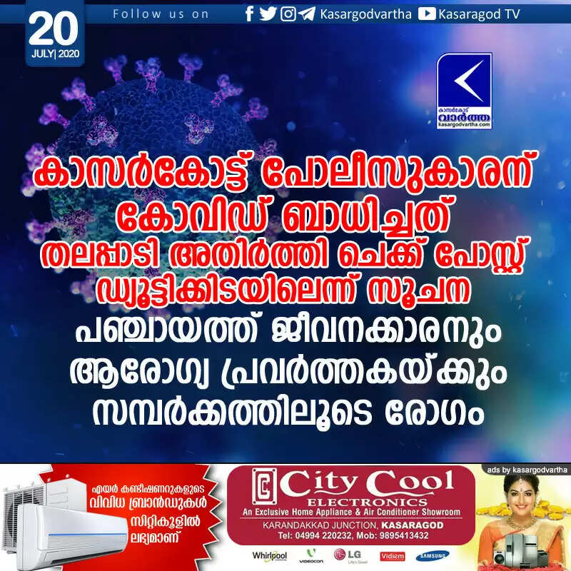Keywords: Kerala, Kasaragod, News, Police-officer, COVID-19, Corona, Panchayath, Worker, Health, Thalappady, Padanna, Pallikara, Kasargod policeman COVID caught during Thalappadi border check post duty.
