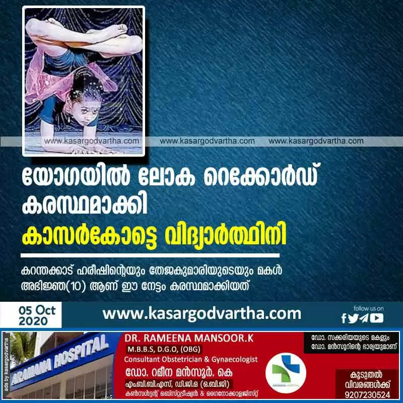 യോഗയില് ലോക റെക്കോര്ഡ് കരസ്ഥമാക്കി കാസര്കോട്ടെ വിദ്യാര്ത്ഥിനി