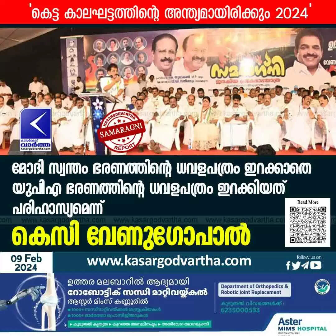 കാസർകോട്: (KasargodVartha) നരേന്ദ്ര മോദി സ്വന്തം ഭരണത്തിൻ്റെ ധവളപത്രം ഇറക്കാതെ യുപിഎ ഭരണത്തിൻ്റെ ധവളപത്രം ഇറക്കിയത് പരിഹാസ്യമാണെന്ന് എഐസിസി ജെനറൽ സെക്രടറി കെ സി വേണുഗോപാൽ പറഞ്ഞു. കെപിസിസി പ്രസിഡണ്ട് കെ സുധാകരൻ, പ്രതിപക്ഷ നേതാവ് വി ഡി സതീശൻ എന്നിവർ നയിക്കുന്ന സമരാഗ്നി പ്രക്ഷോഭയാത്ര ഉദ്ഘാടനം ചെയ്ത് സംസാരിക്കുകയായിരുന്നു കെ സി വേണുഗോപാൽ.