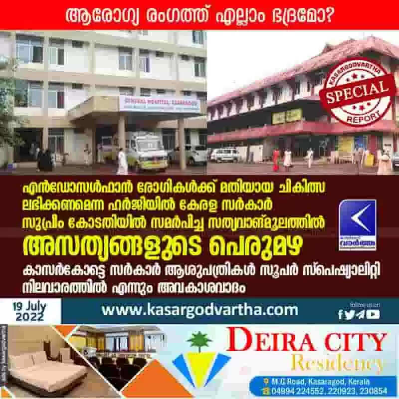 കാസര്‍കോട്: (www.kasargodvartha.com) എന്‍ഡോസള്‍ഫാന്‍ രോഗികള്‍ക്ക് മതിയായ ചികിത്സ ലഭിക്കണമെന്ന ഹര്‍ജിയില്‍ കേരള സര്‍കാര്‍ സുപ്രീം കോടതിയില്‍ സമര്‍പിച്ച സത്യവാങ്മൂലത്തില്‍ അസത്യങ്ങുളുടെ പെരുമഴ. കാസര്‍കോട്ടെ ജനറൽ ആശുപത്രിയും കാഞ്ഞങ്ങാട്ടെ ജില്ലാ ആശുപത്രിയും സൂപര്‍ സ്പെഷ്യാലിറ്റി നിലവാരത്തിലാണെന്നാണ് സത്യവാങ്മൂലത്തിലെ അവകാശവാദം.