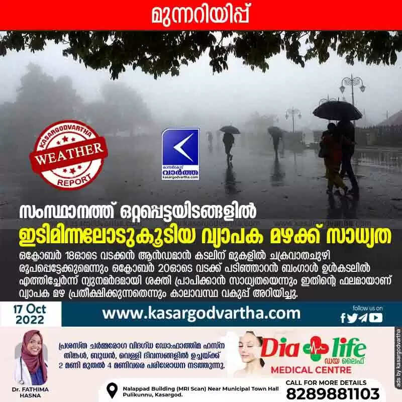 തിരുവനന്തപുരം: (www.kasargodvartha.com) സംസ്ഥാനത്ത് 21 വരെ വ്യാപക മഴയ്ക്ക് സാധ്യത. ഒക്ടോബര്‍ 20 ന് ഒറ്റപ്പെട്ട സ്ഥലങ്ങളില്‍ അതിശക്തമായ മഴയ്ക്കും സാധ്യതയുണ്ട്. ഒക്ടോബര്‍ 18 ഓടെ വടക്കന്‍ ആന്‍ഡമാന്‍ കടലിന് മുകളില്‍ ചക്രവാതചുഴി രൂപപ്പെട്ടേക്കും. പടിഞ്ഞാറ് വടക്ക് പടിഞ്ഞാറ് ദിശയില്‍ സഞ്ചരിച്ച് ഒക്ടോബര്‍ 20 ഓടെ വടക്ക് പടിഞ്ഞാറന്‍ ബംഗാള്‍ ഉള്‍ക്കടലില്‍ എത്തിചേര്‍ന്ന് ന്യുന മര്‍ദമായി ശക്തി പ്രാപിക്കാന്‍ സാധ്യതയെന്നും ഇതിന്റെ ഫലമായാണ് വ്യാപക മഴ പ്രതീക്ഷിക്കുന്നതെന്നും കാലാവസ്ഥ വകുപ്പ് അറിയിച്ചു.