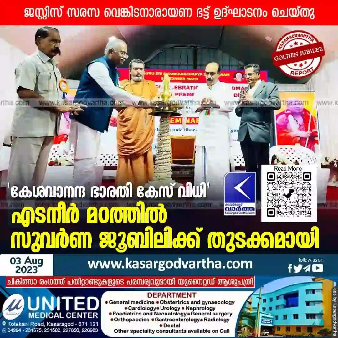 കാസർകോട്: (www.kasrgodvartha.com) ‘കേശവാനന്ദഭാരതി കേസ്‌’ വിധിയുടെ സുവർണ ജൂബിലി ആഘോഷത്തിന് സുപ്രീം കോടതി ജഡ്‌ജ്‌ ജസ്റ്റിസ് സരസ വെങ്കിടനാരായണ ഭട്ട്‌ ഉദ്ഘാടനം ചെയ്‌തതോടെ എടനീർ മഠത്തിൽ തുടക്കമായി.