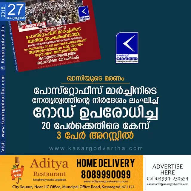 കാസര്‍കോട്: (www.kasargodvartha.com 27.02.2018) ഖാസി സി.എം അബ്ദുല്ല മൗലവിയുടെ ദുരൂഹമരണത്തില്‍ സിബിഐ അന്വേഷണം കാര്യക്ഷമമാക്കണമെന്നാവശ്യപ്പെട്ട് ആക്ഷന്‍ കമ്മിറ്റിയും ഖാസിയുടെ കുടുംബാംഗങ്ങളും ചേര്‍ന്ന് നടത്തിയ പോസ്‌റ്റോഫീസ് മാര്‍ച്ചിനിടെ നേതൃത്വത്തിന്റെ നിര്‍ദേശം ലംഘിച്ച് റോഡ് ഉപരോധിച്ച 20 പേര്‍ക്കെതിരെ കാസര്‍കോട് ടൗണ്‍ പോലീസ് കേസെടുത്തു.