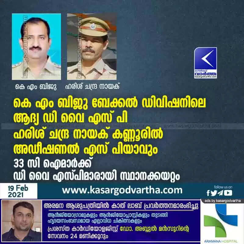 Keywords: Kerala, News, Kasaragod, Top-Headlines, Police, Bekal, DYSP, SP, KM Biju First Bekal DYSP; Harish Chandra Nayak will be Additional SP; Promotion to 33CIs as DYSPs.