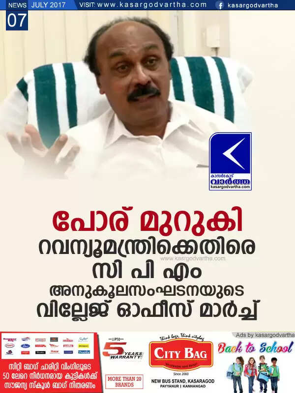 കാഞ്ഞങ്ങാട്: (www.kasargodvartha.com 07.07.2017) മുന്നണി ബന്ധത്തെ ഉലയ്ക്കുന്ന വിധത്തില് സി പി എം- സി പി ഐ പോര് രൂക്ഷമാകുന്നതിനിടെ റവന്യൂമന്ത്രിക്കെതിരെ സി പി എം അനുകൂലസംഘനയുടെ വില്ലേജ് ഓഫീസ് മാര്ച്ച്. റവന്യുവകുപ്പ് മന്ത്രിയുടെ മണ്ഡലം കൂടിയായ മടിക്കൈ വില്ലേജ് ഓഫീസിലേക്ക് സി പി എം നിയന്ത്രണത്തിലുളള കര്ഷക തൊഴിലാളി യൂണിയന് വില്ലേജ് കമ്മിറ്റിയുടെ നേതൃത്വത്തിലാണ് മാര്ച്ച് നടത്തിയത്.