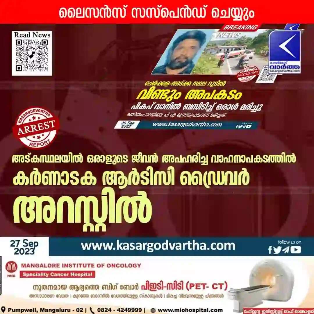 Arrested | അട്കസ്ഥലയിൽ ഒരാളുടെ ജീവൻ അപഹരിച്ച വാഹനാപകടത്തിൽ കർണാടക ആർടിസി ഡ്രൈവർ അറസ്റ്റിൽ