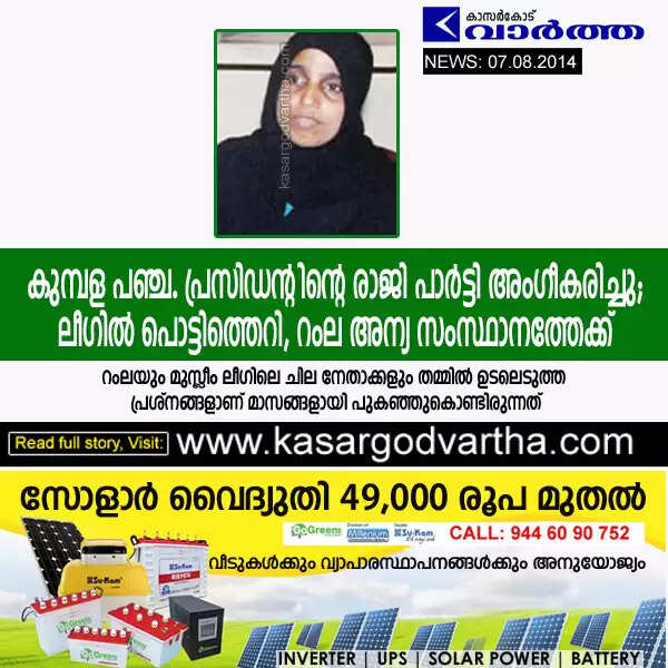കുമ്പള പഞ്ച. പ്രസിഡന്റിന്റെ രാജി പാര്ട്ടി അംഗീകരിച്ചു; ലീഗില് പൊട്ടിത്തെറി, റംല അന്യ സംസ്ഥാനത്തേക്ക്