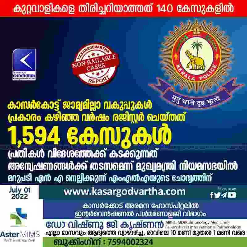 Number of non-bailable FIRs | കാസർകോട്ട് ജാമ്യമില്ലാ വകുപ്പുകൾ പ്രകാരം കഴിഞ്ഞ വർഷം രജിസ്റ്റർ ചെയ്തത് 1594 കേസുകൾ; പ്രതികൾ വിദേശത്തേക്ക് കടക്കുന്നത് അന്വേഷണങ്ങൾക്ക് തടസമെന്ന് മുഖ്യമന്ത്രി നിയമസഭയിൽ; കുറ്റവാളികളെ തിരിച്ചറിയാത്തത് 140 കേസുകളിൽ; മറുപടി എൻ എ നെല്ലിക്കുന്ന് എംഎൽഎയുടെ ചോദ്യത്തിന്
