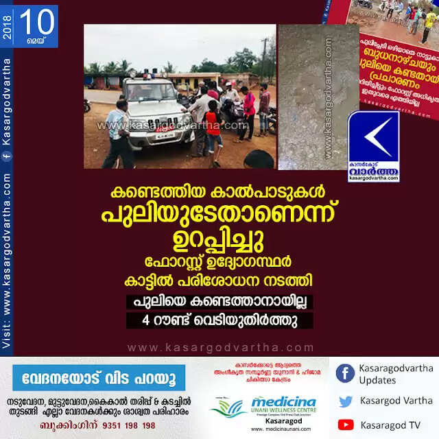 കണ്ടെത്തിയ കാല്പാടുകള് പുലിയുടേതാണെന്ന് ഉറപ്പിച്ചു; ഫോറസ്റ്റ് ഉദ്യോഗസ്ഥര് കാട്ടില് പരിശോധന നടത്തി, പുലിയെ കണ്ടെത്താനായില്ല, 4 റൗണ്ട് വെടിയുതിര്ത്തു