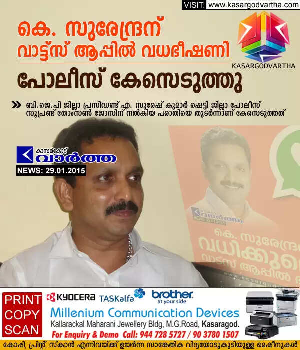 കാസര്കോട്: (www.kasargodvartha.com 29/01/2015) ബിജെപി സംസ്ഥാന ജനറല് സെക്രട്ടറി കെ. സുരേന്ദ്രനെ വധിക്കുമെന്ന് വാട്ട്സ് ആപ്പില് ഭീഷണി മുഴക്കിയ സംഭവത്തില് ടൗണ് പോലീസ് കേസെടുത്തു. പാര്ട്ടിയുടെ ജില്ലാ പ്രസിഡണ്ട് എ. സുരേഷ് കുമാര് ഷെട്ടി ജില്ലാ പോലീസ് സൂപ്രണ്ട് തോംസണ് ജോസിന് നല്കിയ പരാതിയെ തുടര്ന്നാണ് കേസ്.