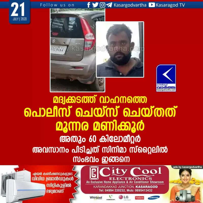 കാസര്‍കോട്:  (www.kasargodvartha.com 21.07.2020) മദ്യക്കടത്ത് വാഹനത്തെ പൊലീസ് ചെയ്‌സ് ചെയ്തത് മൂന്നര മണിക്കൂറോളം. 60 കിലോമീറ്ററോളമാണ് മദ്യക്കടത്ത് സംഘം പൊലീസിനെ വട്ടം കറക്കിയത്. സംഭവത്തില്‍ ഒരാളെ അറസ്റ്റ് ചെയ്തു. കാറിലുണ്ടായ മറ്റൊരാള്‍ പൊലീസിനെ വെട്ടിച്ച് രക്ഷപ്പെട്ടു. മിയാപ്പദവ് ചികുര്‍പാദയിലെ ചന്ദ്രശേഖറാണ്(33) അറസ്റ്റിലായത്.