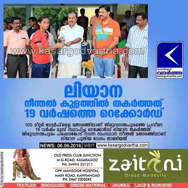 Keywords: Kasaragod, Kerala, Melparamba, Swimming, Thiruvananthapuram, State, 100 mr Butterfly, Gold Medal, Liyana Fathima,