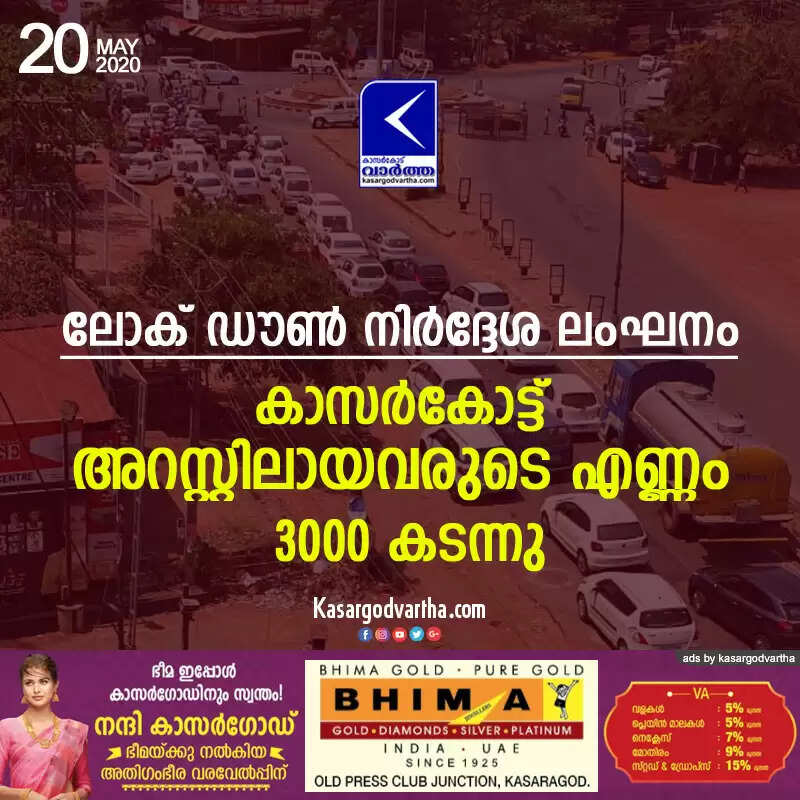 ലോക് ഡൗണ്‍ നിര്‍ദ്ദേശ ലംഘനം: കാസര്‍കോട്ട് അറസ്റ്റിലായവരുടെ എണ്ണം 3000 കടന്നു