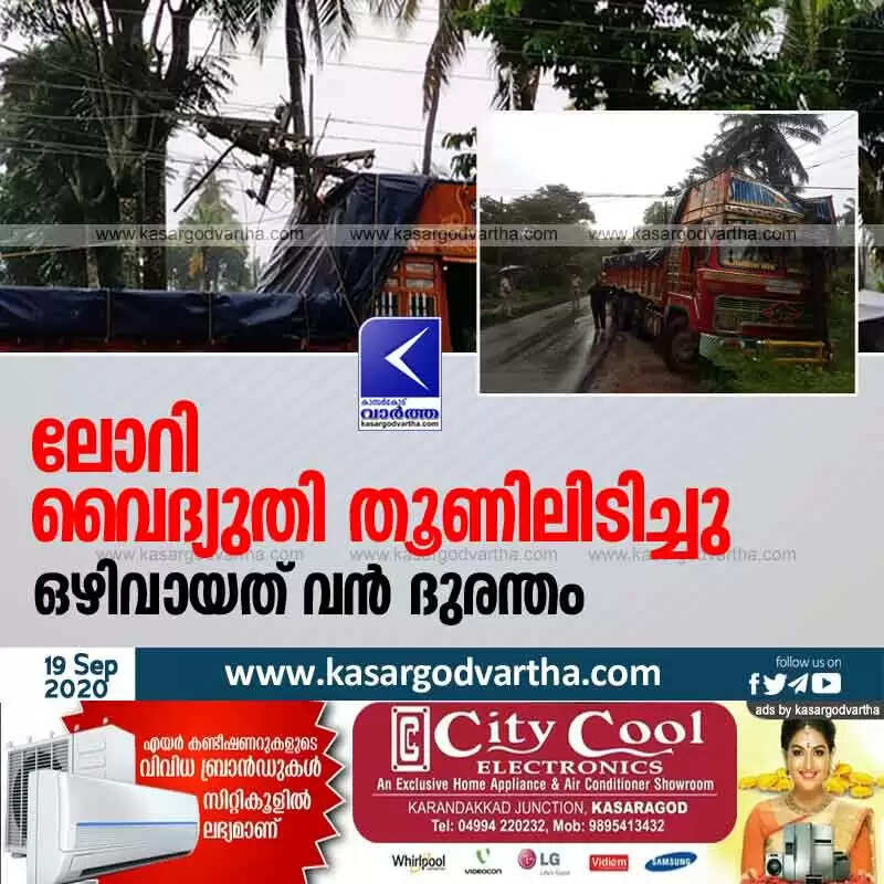 ചെറുവത്തൂര്‍: (www.kasargodvartha.com 19.09.2020) ചരക്കുലോറി വൈദ്യുതി തൂണിലിടിച്ചു. അപകടത്തെ തുടര്‍ന്ന് ഉണ്ടാകുമായിരുന്ന വന്‍ ദുരന്തമാണ് ഒഴിവായത്.