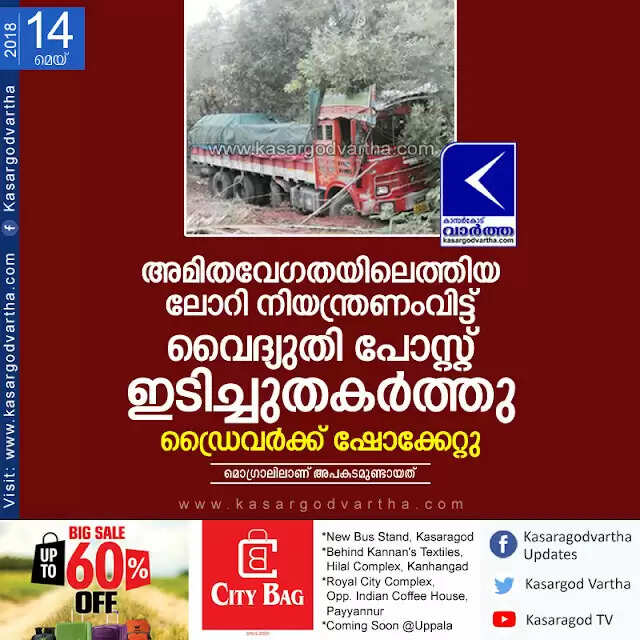 Keywords: Mogral, Kasaragod, Kerala, News, Lorry, Electric post, Driver, Shock, Accident, Natives, Lorry hits Electric post at Mogral.