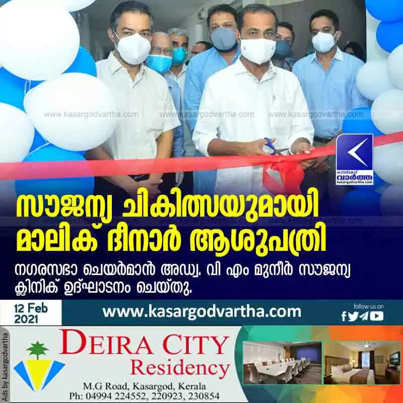 കാസർകോട്: (www.kasargodvartha.com 12.02.2021) ജനങ്ങൾക്ക് കാരുണ്യ ഹസ്തവുമായി മാലിക് ദീനാർ ആശുപത്രിയിൽ സൗജന്യ ചികിത്സയ്ക്ക് തുടക്കമായി. നഗരസഭാ ചെയർമാൻ അഡ്വ. വി എം മുനീർ ഉദ്ഘാടനം ചെയ്തു. ഡോ. റിങ്കുവിന്റെ കീഴിലാണ് സൗജന്യ ചികിത്സ ലഭ്യമാകുക. എല്ലാ വെള്ളിയാഴ്ചകളിലും രാവിലെ 9 മണി മുതൽ വൈകുന്നേരം 6 മണി വരെ സേവനം ലഭിക്കും. പ്രമേഹം, പ്രഷർ, ബി എം ഐ എന്നീ പരിശോധനകൾ സൗജന്യമായിരിക്കും. ഫാർമസി, ലാബ് എന്നിവയ്ക്ക് അഞ്ചു ശതമാനം കിഴിവും തുടർ ചികിത്സ ആവശ്യമെങ്കിൽ 10 ശതമാനം കിഴിവും ലഭിക്കും. കൂടുതൽ വിവരങ്ങൾക് 9995007777, 04994-230306, 230112 നമ്പറിൽ ബന്ധപ്പെടാവുന്നതാണ്.